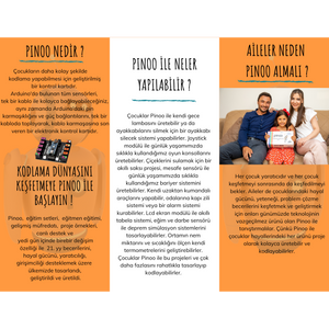 Pinoo; It is a control card developed for children aged 7 and over to code with Arduino more easily. It is an electronic circuit board that you can easily connect all the sensors in the Arduino with a cable, and also ends the cable clutter by gathering the pin complexity and power connections in the Arduino in a single cable.